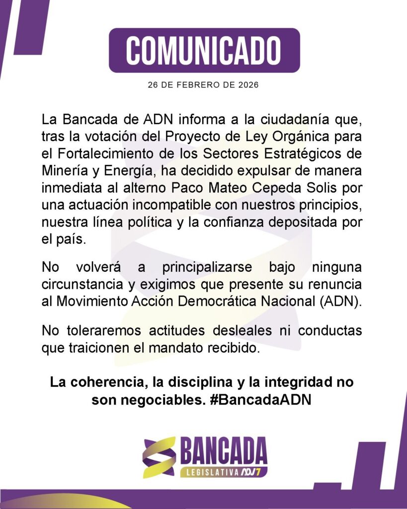 Pocos minutos después de la votación, la bancada de ADN informó que tomó la decisión de expulsar a Paco Cepeda y lo conminó a que presente su renuncia como asambleísta alterno.