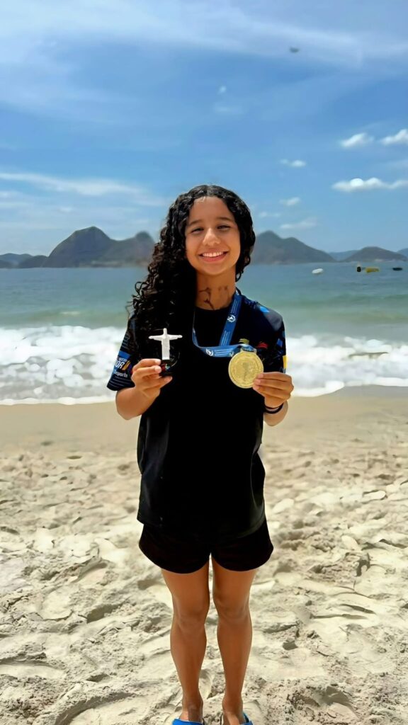 Con tan solo 16 años, la nadadora manabita registró un tiempo de dos horas, 39 minutos y 22 segundos y se subió a lo más alto del podio.
