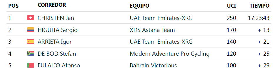 A once segundos entró el sudafricano Byron Munton. A 32, el grupo perseguidor, donde viajaban Igor Arrieta, Juan Pedro Lozano y Sergio Higuita. Al vasco le bastó para subirse al cajón y redondear el dominio del UAE en el podio.