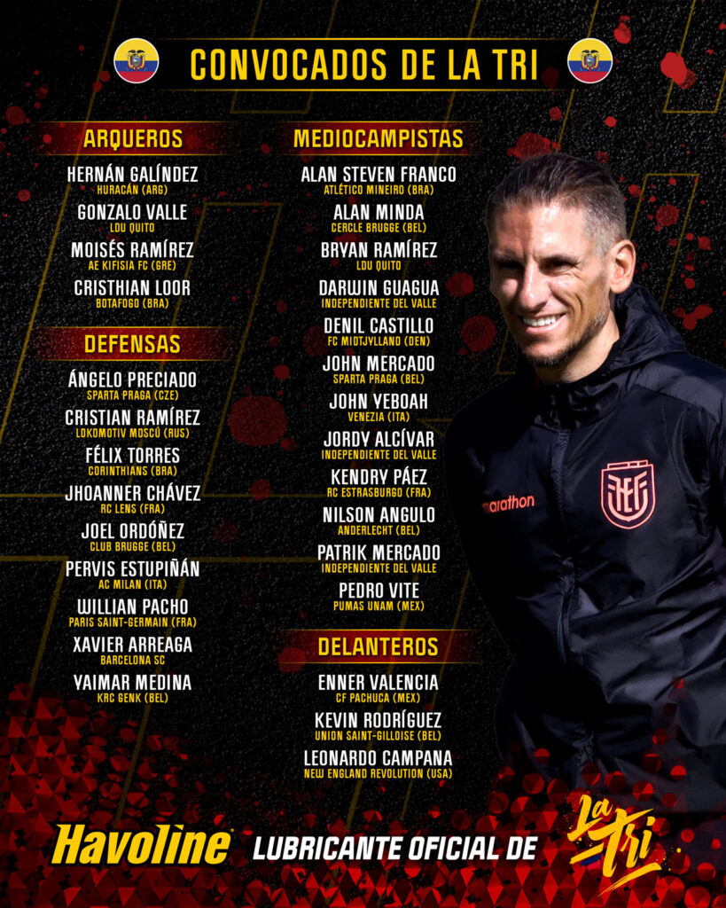 La Federación Ecuatoriana de Fútbol publicó la nómina de futbolistas que integrarán la Selección para los próximos dos partidos por la Fecha FIFA de octubre.