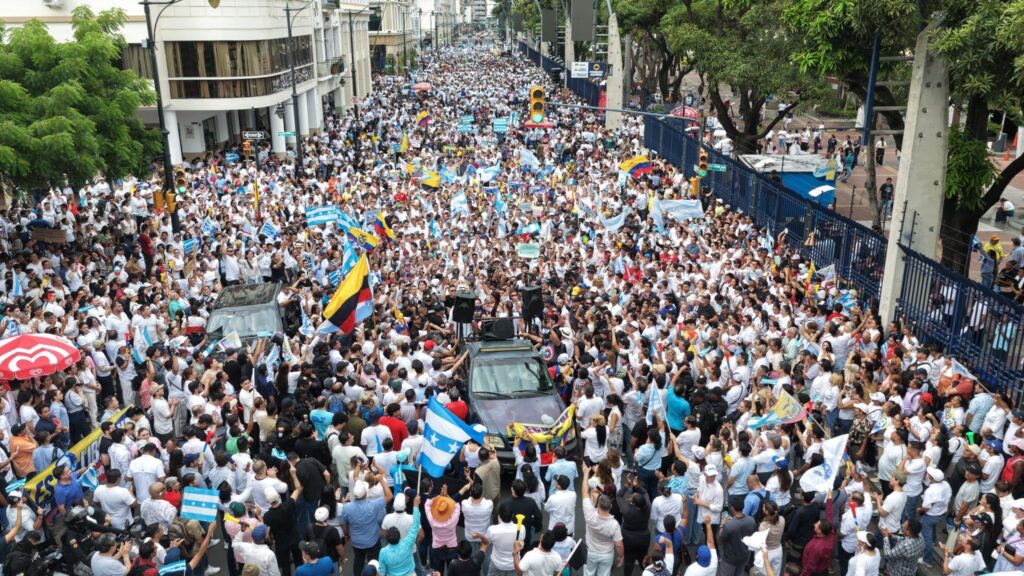 Eran cerca de las 15:30 cuando dos hechos ocurrían simultáneamente en Guayaquil. Por un lado, quienes se preparaban para marchar contra la detención del alcalde se concentraban en el Parque Centenario, en pleno centro de la ciudad. Y por otro, a unas quince cuadras de distancia, frente al Municipio —donde debía terminar la movilización—, la Policía daba cumplimiento a la orden del gobernador del Guayas, José Ignacio Arévalo, de retirar la tarima en la que se tenían previstos los discursos. La zona se llenó de policías y militares en espera de la marcha, que ya avanzaba por la avenida 9 de Octubre.