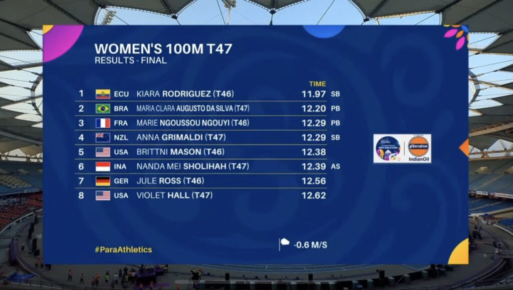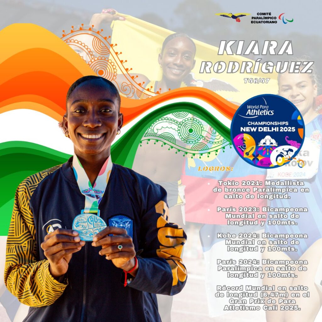 La deportista ecuatoriana Kiara Rodríguez brilla a nivel internacional y es tricampeona mundial en los 100 metros planos T46/47, al conquistar la medalla de oro en el Campeonato Mundial de Paratletismo que se realiza en Nueva Delhi, India.