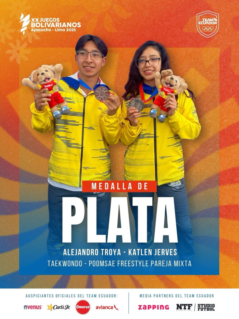 La dupla tricolor conformada por Katlen Jerves y Alejandro Troya se quedó con la medalla de plata en Freestyle Pareja Mixta de la modalidad Poomsae en Taekwondo, logrando el subtítulo bolivariano en Ayacucho–Lima 2025.