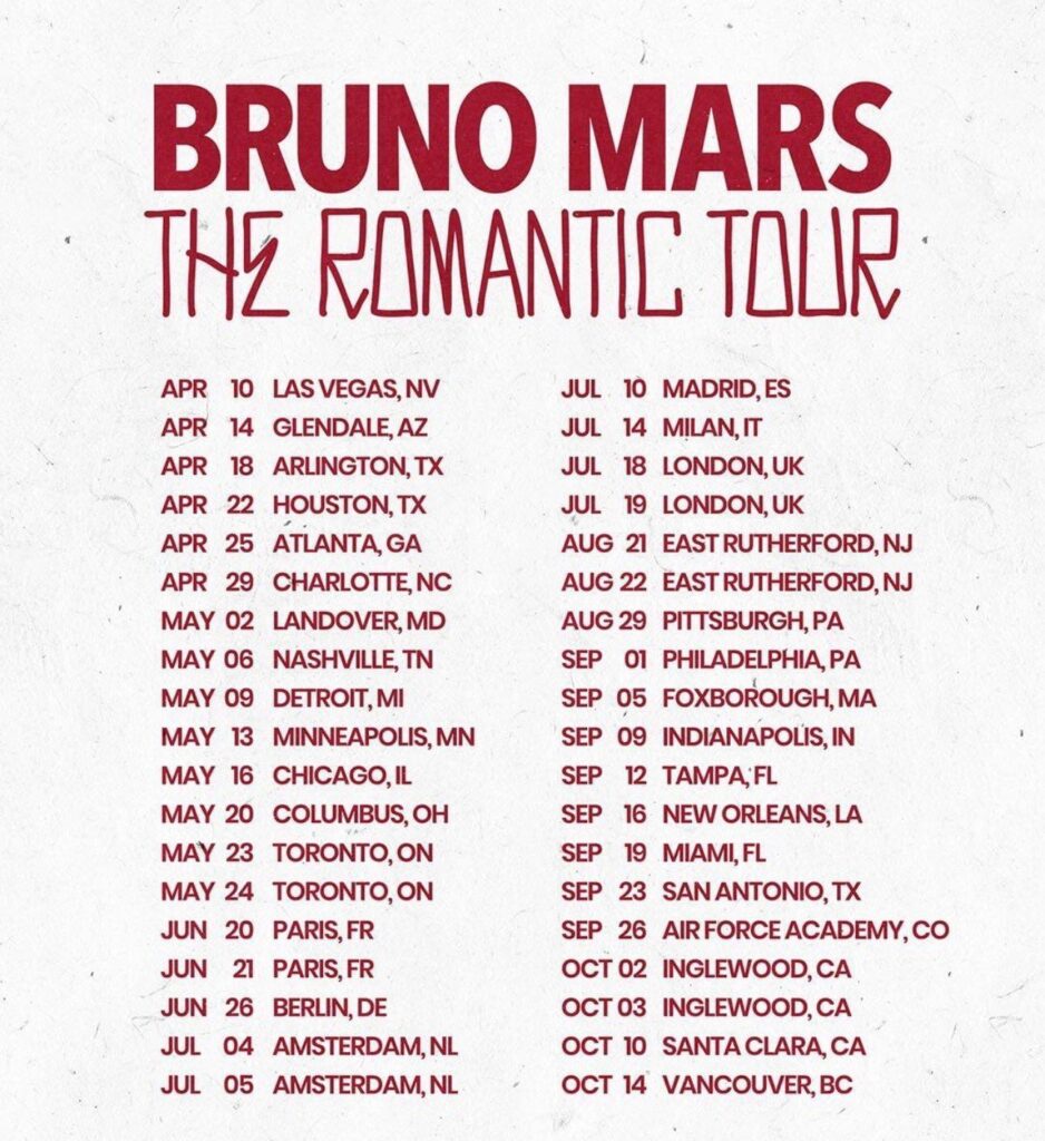 Su primera gira tiene previsto arrancar en abril y se extenderá hasta octubre, con una ruta que contempla escenarios de Europa, Norteamérica y Reino Unido, donde Mars ofrecerá alrededor de 38 conciertos en ciudades clave. Con este movimiento, el cantante vuelve a posicionarse como una de las figuras más esperadas del pop en vivo. El nuevo álbum promete retomar ese sonido pulido, romántico y retro que ha caracterizado su estilo, aunque aún no se han revelado muchos detalles sobre la lista de canciones o las colaboraciones que incluirá.