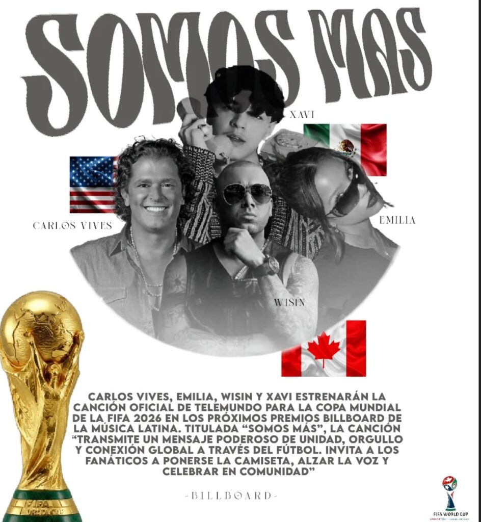 En este caso, Carlos Vives, Emilia, Wisin y Xavi serán los encargados de estrenar la canción oficial de Telemundo para el Mundial 2026. El lanzamiento se realizará durante los Premios Billboard de la Música Latina, que se transmitirán en vivo el jueves 23 de octubre por la cadena estadounidense. El tema lleva por título ‘Somos más’ y, según un comunicado, busca “transmitir un mensaje poderoso de unidad, orgullo y conexión global a través del fútbol”. La canción invita a los fanáticos a celebrar juntos, ponerse la camiseta y vivir la pasión del torneo con alegría y espíritu de comunidad.