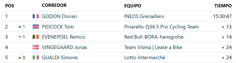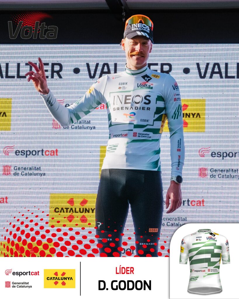La segunda posición de Dorian Godon permitió al francés conservar el liderato de la clasificación general tras cuatro etapas. El corredor de Ineos Grenadiers comanda ahora la Volta con un tiempo acumulado de 15:30:47, con Thomas Pidcock a 13 segundos y Remco Evenepoel a 14. Jonas Vingegaard, uno de los grandes favoritos al triunfo final, es cuarto a 24 segundos antes de la llegada de la montaña más exigente.