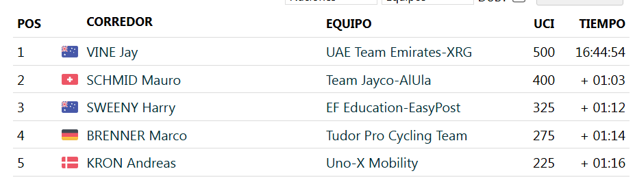 Tras el final en Stirling, cerca de Perth, Vine inscribió así su nombre por segunda vez en el palmarés de esta prestigiosa carrera por etapas en el hemisferio sur, después de su victoria en 2023. En la general supera al suizo Mauro Schmid (Jayco Alula) y a su compatriota Harry Sweeny (EF Education Easypost)