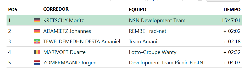 En cuanto a la clasificación general, el alemán Moritz Kretschy (NSN Development Team) mantuvo el liderato de la carrera. El podio lo completan su compatriota Johannes Adamietz (Rembe | rad-net) y el etíope Amaniel Teweldemedhn Desta (Team Amani).