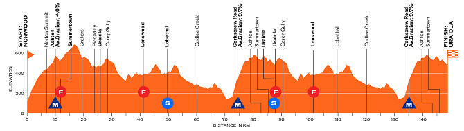 La segunda jornada entre Norwood y Uraidla será importante para la general, con puertos exigentes en el menú. De inicio subida a Norwood, y en dos ocasiones se ascenderá «Corkscrew», un muro para probar a los favoritos. Además, el final es ondulado.