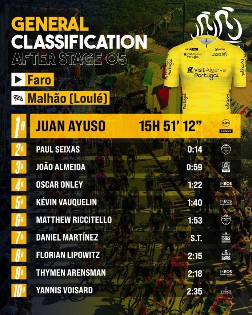 La guinda del pastel del domingo para Juan Ayuso fue la victoria en la etapa, un recorrido montañoso de 148,4 kilómetros entre la capital de la región, Faro, y la subida al Alto do Malhão, en la ciudad de Loulé, que completó en 3 horas, 20 minutos y 20 segundos.