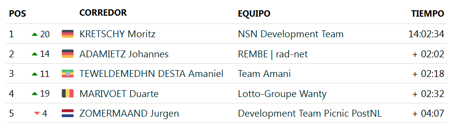 La resolución llegó en los últimos 500 metros. De Clercq lanzó su ofensiva definitiva, adelantó a Kretschy en las dos últimas curvas y, con un sprint seco a 100 metros de meta, certificó la victoria en Rubavu con un tiempo de 3 horas, 5 minutos y 55 segundos.