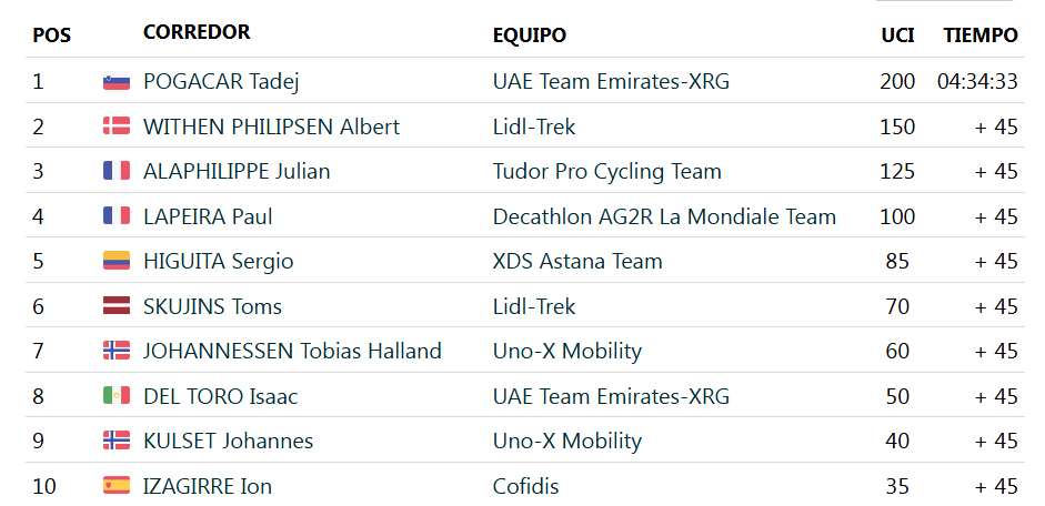 El prometedor, Albert Withen Philipsen, de 19 años y Alaphilippe le acompañaron el podio tras un apretado esprint que decidió el gran grupo que entró a 45 segundos del vencedor. El danés de Lidl-Trek fue segundo y el veterano francés de Tudor, tercero. El mejor español en liza fue Ion Izagirre que, de esta forma, celebra la renovación por una temporada con Cofidis que MARCA ha adelantado hoy.