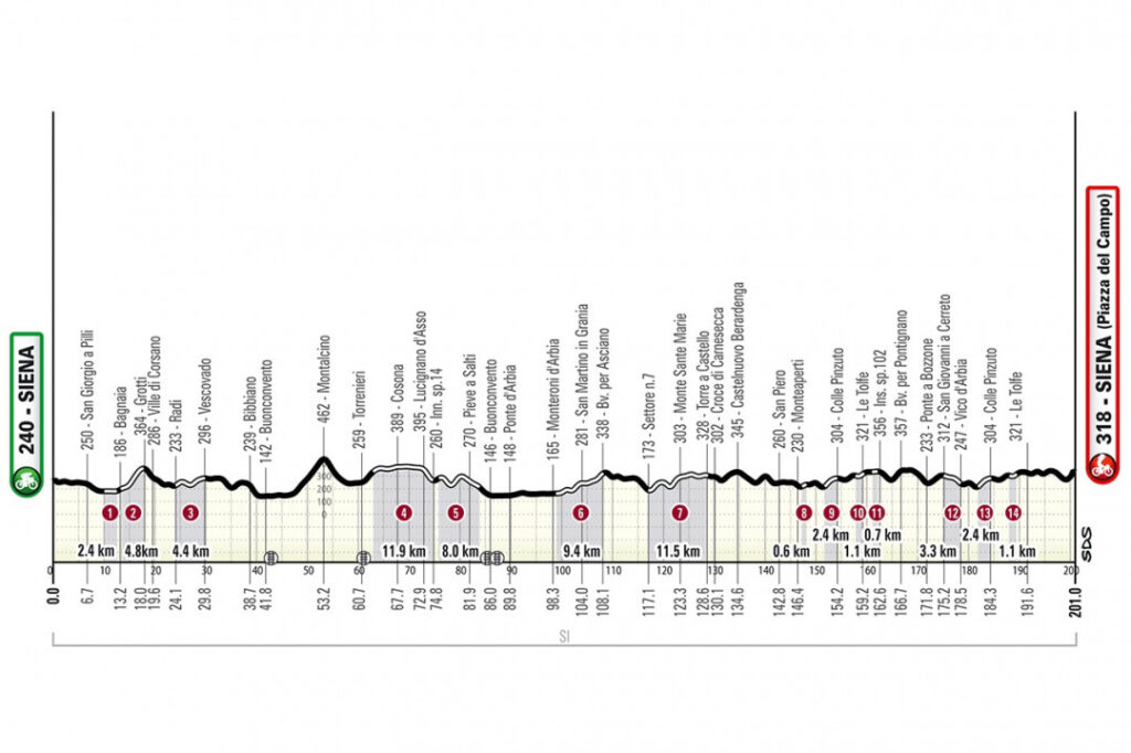 Debido a los exigentes porcentajes del Colle Pinzuto y Le Tolfe, los últimos 20 kilómetros estarán llamados a decidir la prueba, ya que este segundo encadenado será el encargado de separar el grano de la paja entre los favoritos. Sin embargo, el broche de oro de la 20.ª edición de la Strade Bianche se pondrá en la vía Santa Caterina, icónica ascensión que conducirá a los corredores hasta una Piazza del Campo que coronará al rey de la Toscana.