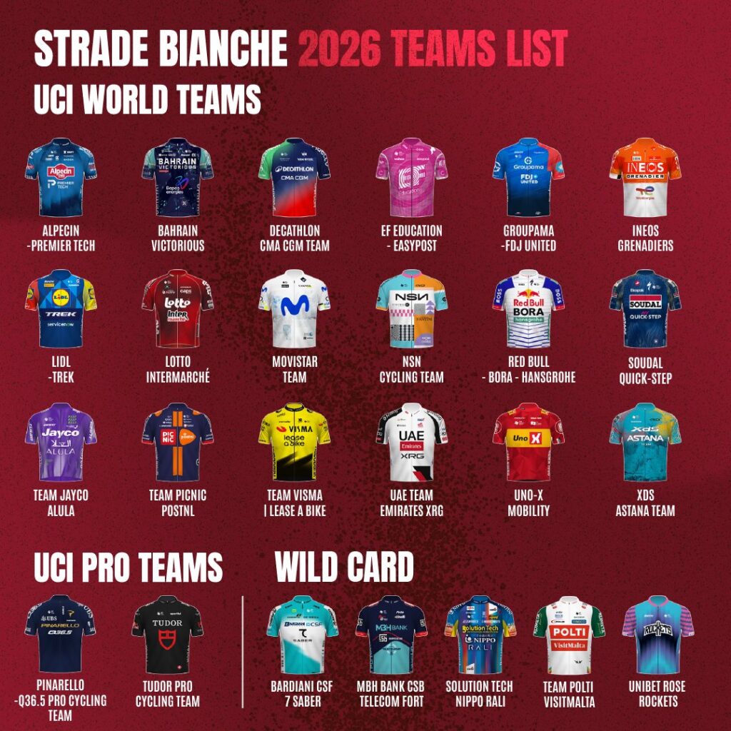 La Strade Bianche 2026 contará con una constelación de estrellas acorde a las características y al espectáculo de dicha prueba. Si a esto le sumamos un palmarés en el que figuran históricos del calibre de Tadej Pogacar, Fabian Cancellara, Mathieu van der Poel, Wout van Aert o Tom Pidcock, nos encontramos con una carrera que concentrará todos los focos.