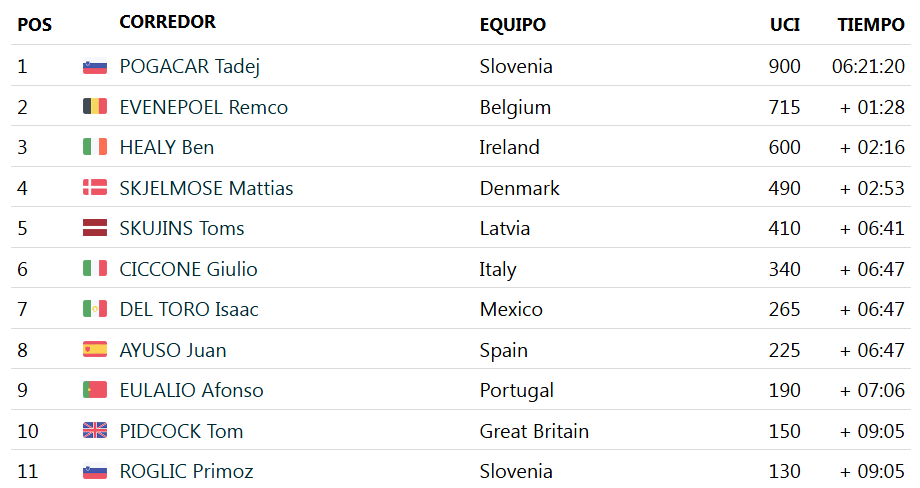 El irlandés Ben Healy completó el podio, mientras que el mexicano Isaac del Toro fue séptimo, justo por delante del español Juan Ayuso, y el colombiano Harold Tejada fue 14.º.