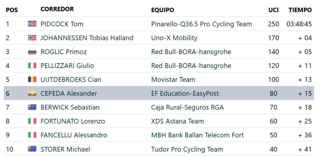 Respecto a los colombianos, el mejor fue Diego Pescador, del Moivistar Team, en el puesto 27, a un minuto y cinco segundos, mientras que Einer Rubio, también de la escuadra telefónica, fue 29, a 1′ 16». Cabe aclarar que ninguno de los dos era líder, sino que oficiaron como gregarios de Cian Uijtdebroeks, quien finalizó de quinto, a 13 segundos del vencedor.