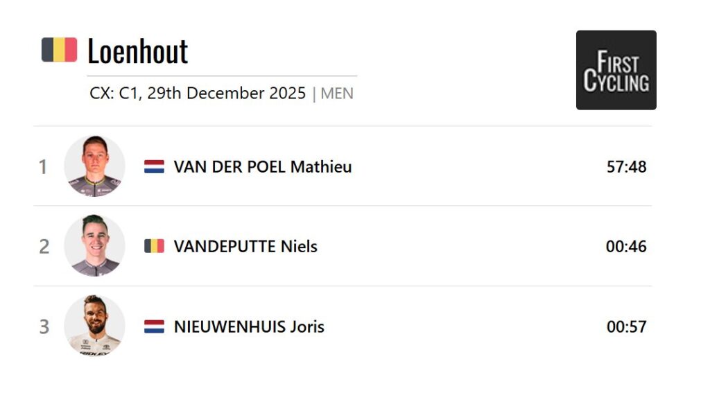 El neerlandés Joris Nieuwenhuis fue tercero a 57 segundos, tras imponerse al esprint a su compatriota Ryan Kamp y al belga Toon Aerts. Van der Poel y Van Aert volverán a competir en el Exact Cross en Mol, el próximo viernes, 2 de enero, y dos días después Zonhoven, prueba de la Copa del Mundo, donde el neerlandés ya ha conseguido cuatro victorias. En categoría femenina, la neerlandesa Lucinda Brand, líder de la general de la Copa del Mundo, volvió a demostrar que es la más fuerte de la especialidad y logró la victoria en Loehnhout.