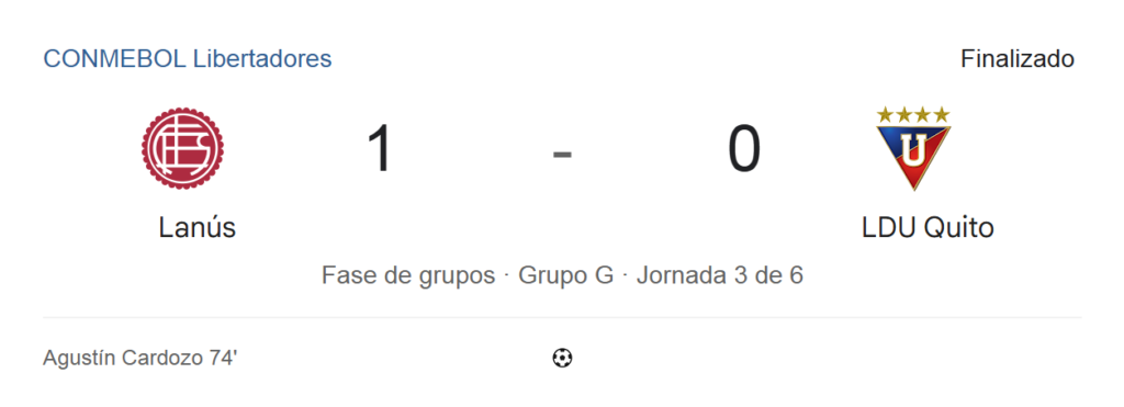 Liga de Quito perdió 1-0 en su visita a Lanús, por la tercera fecha de la fase de grupos de la CONMEBOL Libertadores. El equipo ecuatoriano perdió su invicto en este torneo, tras las dos victorias que logró anteriormente; además encajó su primer gol en Libertadores y no sale de un momento irregular en la temporada.