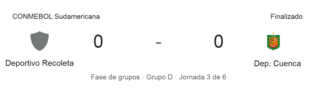 Con el empate sin goles, Deportivo Cuenca hace cuatro puntos en la fase de grupos de la Copa Sudamericana y se ubica segundo. Mientras que Recoleta hace tres unidades y es tercero.