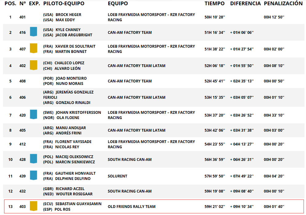 A bordo del Polaris RZR Pro R Rally, la dupla ecuatoriano-española finalizó la etapa en el puesto 15 de la categoría SSV, sumando así su cuarto Top 15 consecutivo, una clara muestra de regularidad y solidez en la recta final de la competencia, cuando el desgaste físico y mecánico comienza a marcar diferencias.