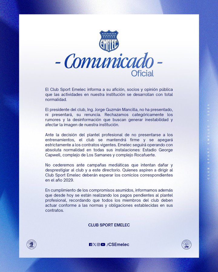 En este caso, la institución eléctrica señaló que el ingeniero Guzmán no ha presentado, ni presentará su renuncia, y rechazó «de forma categórica los rumores y la desinformación» que, según el comunicado, buscan generar inestabilidad y afectar la imagen del club. Además, Emelec también se refirió a la decisión del plantel profesional de no presentarse a los entrenamientos, afirmando que mantendrá una postura firme y que se apegará estrictamente a los contratos vigentes. «El club seguirá operando con absoluta normalidad en todas sus instalaciones: estadio George Capwell, complejo de Los Samanes y complejo Rocafuerte», detalló la directiva azul.