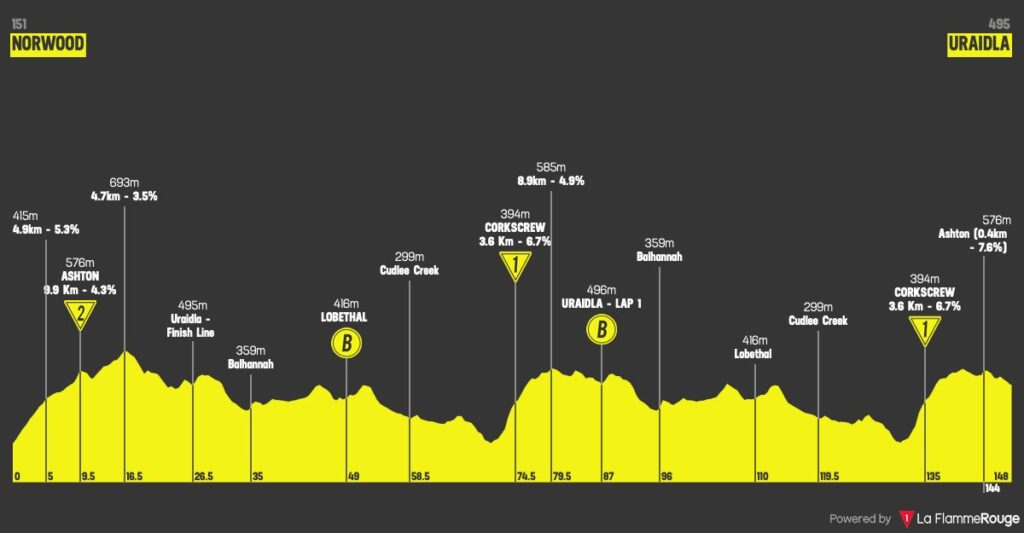 Con 148,1 kilómetros de recorrido a través de un trazado montañoso, la segunda etapa en línea de la presente edición del Tour Down Under se presenta como el primer gran examen en la carrera por la clasificación general. La doble ascensión al célebre ‘Corkscrew’ apunta a ser el punto clave en el que se abran diferencias entre los candidatos y el resto del pelotón.