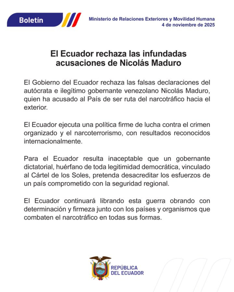 «El Gobierno de Ecuador rechaza las falsas declaraciones del autócrata e ilegítimo gobernante venezolano Nicolás Maduro, quien ha acusado al país de ser ruta del narcotráfico hacia el exterior», dice un comunicado de la Cancillería ecuatoriana publicado este martes 4 de noviembre.