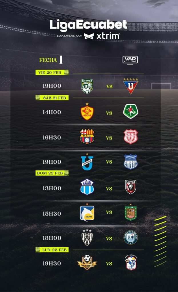 En este sentido, el primer partido de la competición de este año se disputará en Machala con el enfrentamiento entre Orense y Liga de Quito, en el estadio 9 de Mayo, el viernes 20 de febrero. Mientras que, el sábado 21 de febrero: Aucas recibe al Mushuc Runa; Barcelona SC enfrenta a Técnico Universitario y Emelec visita a la Universidad Católica.