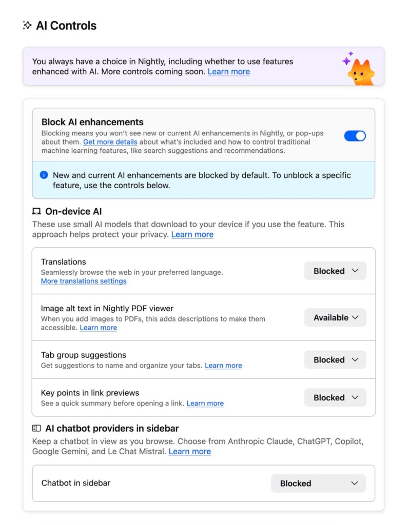Ahora, la próxima versión de Firefox incluirá una sección de controles de IA en la configuración del navegador, que permitirá administrar cada función de IA de forma individual además. De esta forma, Firefox ofrece a los usuarios renunciar a la IA mientras ellos avanzan en su desarrollo. Entre las funciones que los usuarios pueden administrar se encuentran la traducción de páginas, texto alternativo en archivos PDF, agrupación de pestañadas mejoradas con IA, vistas previas de enlaces y la aparición de un ‘chatbot’ de IA en la barra lateral (incluye Claude, ChatGPT, Copilot, Gemini y Mistral).