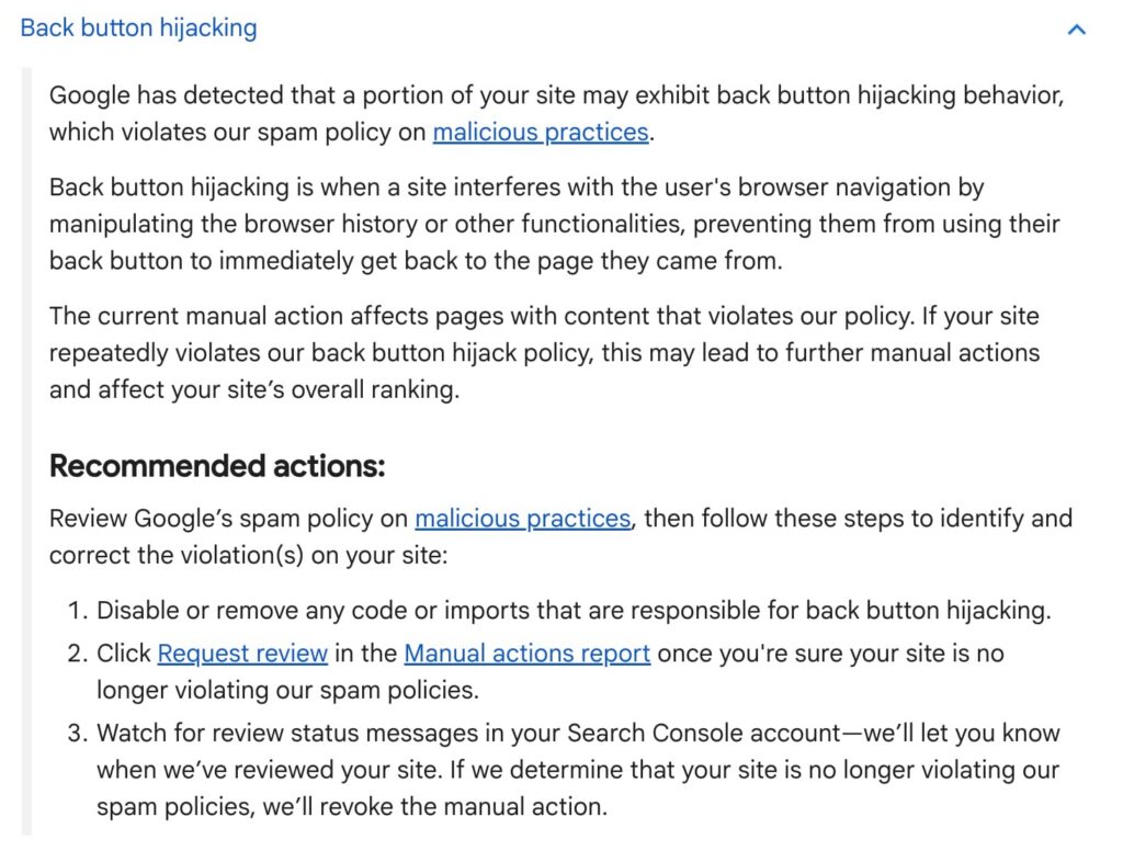 Según la compañía tecnológica ha incluido esta práctica dentro de sus políticas antispam, lo que supone tomará medidas contra las páginas que utilicen el botón de retroceso «de forma fraudulenta», pudiendo afectar a su posicionamiento en los resultados de búsqueda de Google.