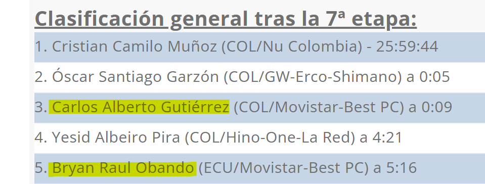 Los ciclistas del Movistar Best PC, el colombiano Carlos Gutiérrez y Jimmy Santiago Montenegro se mantienen en la pelea por el liderato de la clasificación genaral y los premios de montaña, tras la séptima etapa de la edición 64 de la Vuelta a Guatemala.