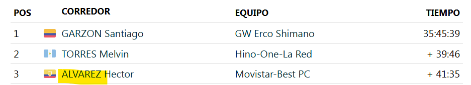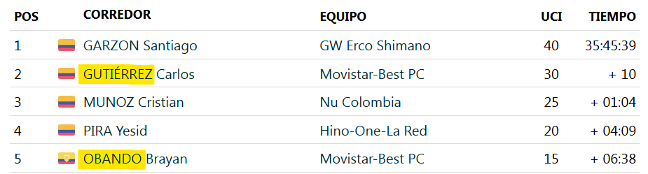 En la clasificación general, por detrás de los pedalistas Telefónicos se ubicaron sus compañeros: Santiago Montenegro, en el puesto 22, Álvarez en el 28, Byron Guamá en el 36 y Richard Huera en el 47.