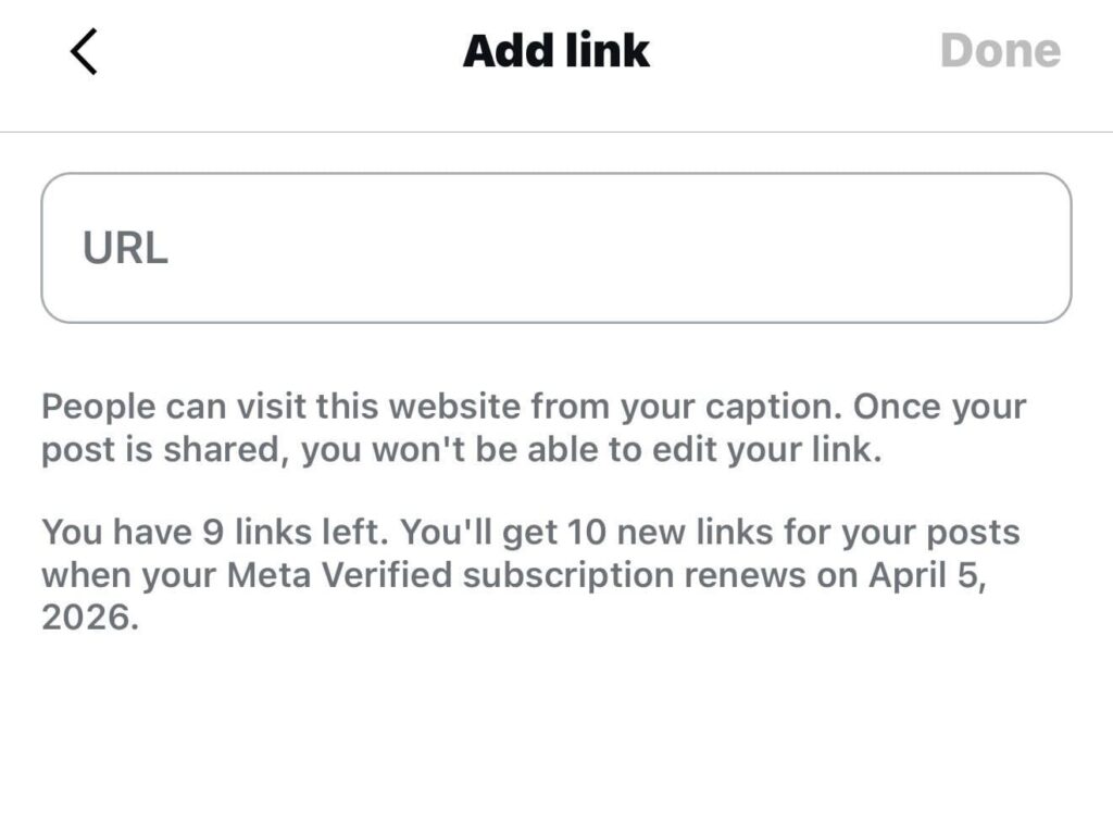 La plataforma Meta prueba una nueva función que permite a los usuarios añadir enlaces en los pies de fotos de las publicaciones en Instagram, pero solo a aquellos que estén suscritos a Meta Verified.