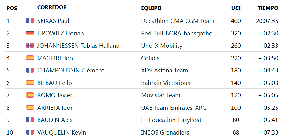 El podio de la ronda vasca lo completaron el alemán Florian Lipowitz (Red Bull-BORA-hansgrohe) y el noruego Tobias Halland Johannessen (Uno-X Mobility), quienes terminaron en el 2° y 3°, puesto respectivamente.