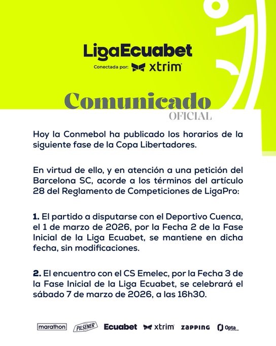 Asimismo, informaron que, tras una petición de Barcelona SC y acorde a los términos del artículo 28 del Reglamento de Competiciones, el cuadro torero mantendrá su compromiso frente a Deportivo Cuenca. “El partido a disputarse con Deportivo Cuenca, el 1 de marzo de 2026, por la Fecha 2 de la Fase Inicial de la Liga Ecuabet, se mantiene en dicha fecha, sin modificaciones”, señala el comunicado oficial.