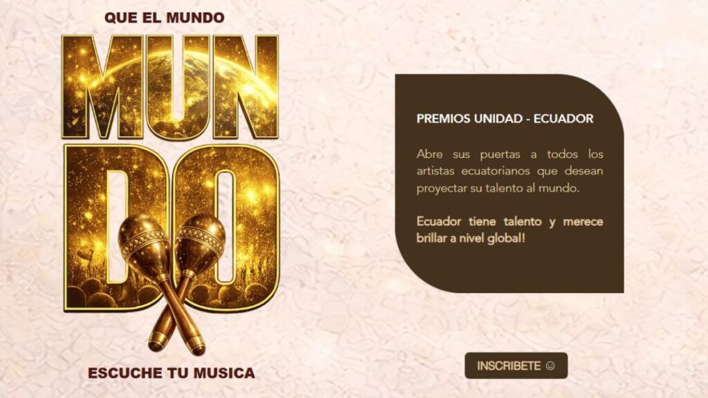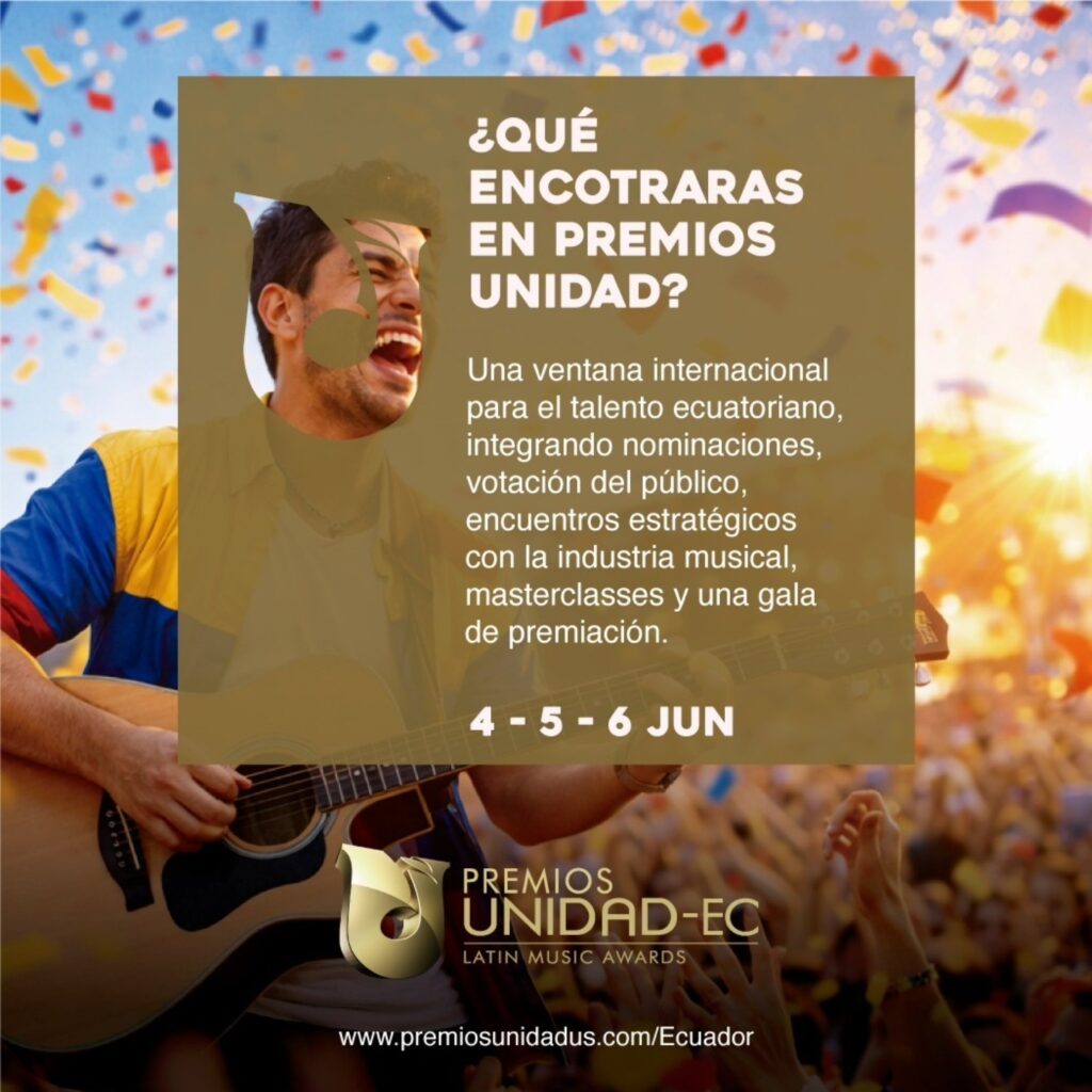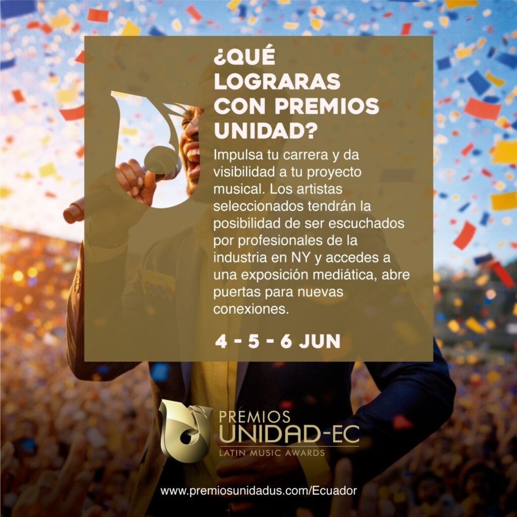 Los Premios Unidad Latin Music Ecuador 2026 llegan a Quito del 4 al 6 de junio de 2026 y las inscripciones para participar están abiertas hasta el próximo 17 de abril. «Pueden postular a los Premios Unidad Latin Music artistas latinos, especialmente aquellos de mercados emergentes, que ya estén dedicados a la música y cuenten con material de calidad (EPK, video, producción, fotografías). No es un programa para «hacer una estrella», sino para artistas ya establecidos o con un nivel profesional que quieran expandir sus carreras», precisa Joseph Albán, director general del evento.