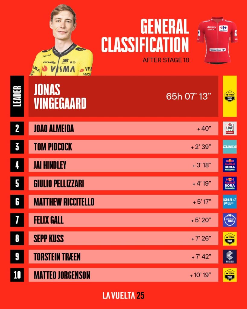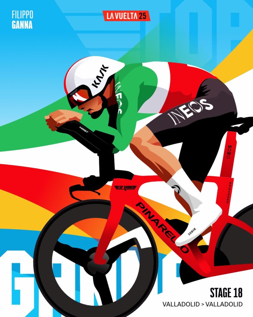 El italiano Filippo Ganna (Ineos Grenadiers) se ha impuesto en la recortada decimoctava etapa de la Vuelta a España, disputada en la modalidad de contrarreloj individual con un recorrido de 12,2 km, mientras que el danés Jonas Vingegaard (Visma) mantiene el maillot rojo de líder.
