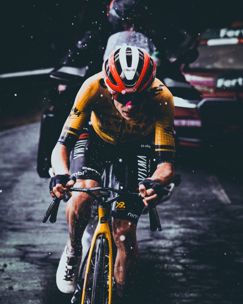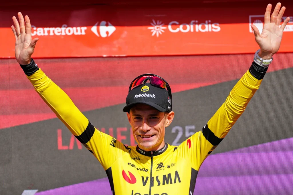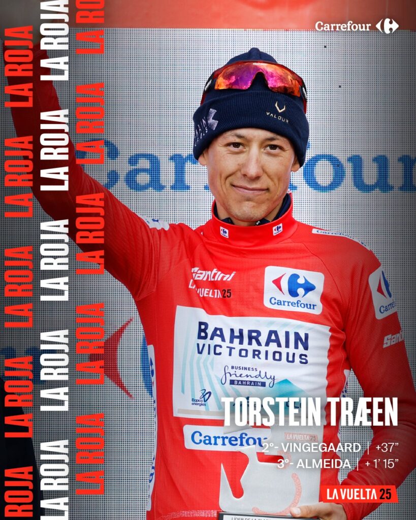 n el peor momento de la tempestad, con el agua cayendo sobre la ruta de la Vuelta, con el viento moviendo las banderolas de la meta de Valdezcaray, el estadounidense Matteo Jorgenson, compañero de Vingegaard, realizó un esprint para lanzar a su jefe, poco después de que el danés dijera a los compañeros del Visma que iba a por todas, a por la etapa, a soltar a los rivales y si podía a vestirse con el jersey rojo que el noruego Torstein Traeen conservó por 37 segundos a las puertas de una segunda semana de competición -este lunes descansa la carrera- que pone los pelos de punta con subidas como la del Angliru programada para el viernes.