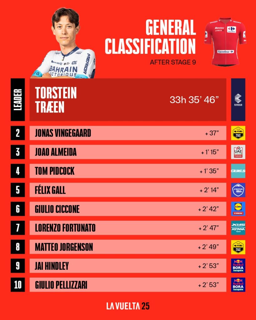 El ciclista danés Jonas Vingegaard (Visma-Lease a Bike) se ha impuesto este domingo en la novena etapa de la Vuelta Ciclista a España, disputada entre la localidad riojana de Alfaro y la Estación de Esquí de Valdezcaray, sobre 195,5 kilómetros, mientras que el noruego Thorsten Traeen (Bahrain-Victorius) ha sufrido para mantener el liderato.