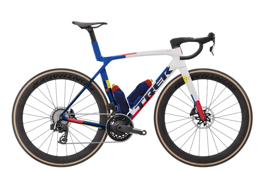 Contando con la firma de Waterloo como uno de sus patrocinadores principales, obviamente la bicicleta del ahora equipo alemán no podía ser otra que una Trek, en concreto, su modelo Madone tras unificar hace unos años los norteamericanos su bici escaladora y la aerodinámica bajo esta denominación. Se mantiene también la colaboración con SRAM en uno de los equipos que confió en la marca desde la misma llegada de los grupos AXS.