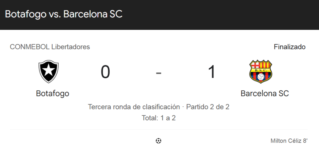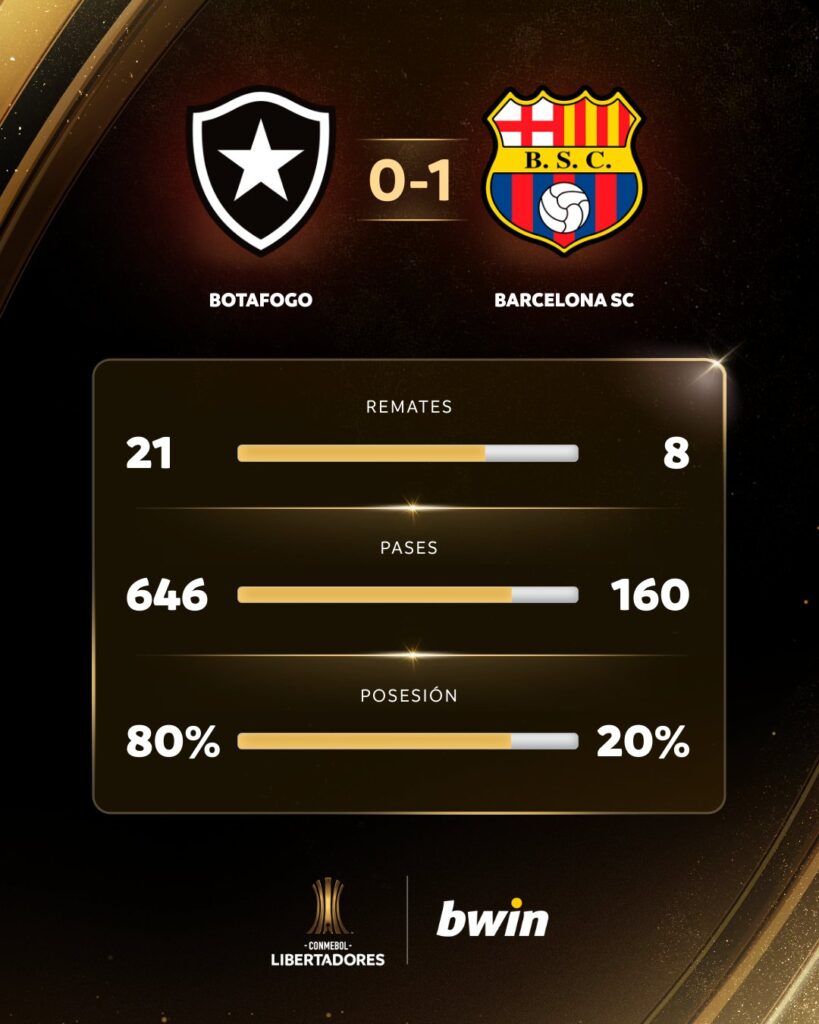Después, el juego se mantuvo igual, con el dominio de Botafogo, pero con poca resolución ofensiva. La defensa de Barcelona se mostró sólida ante esas arremetidas, con la presencia de Álex Rangel, Luca Sosa y Javier Báez.