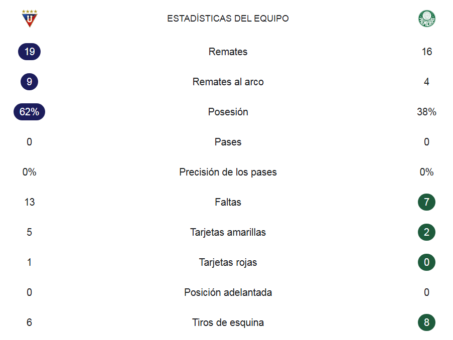 El partido bajó el ritmo porque así lo quiso Liga, por lo que Palmeiras tuvo algo más de control. Liga casi no pasó apremios en defensa, pero mantuvo las luces encendidas para apelar a un contragolpe.