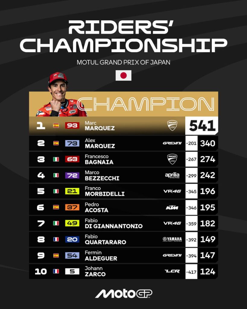 En la carrera de este domingo, ganada en Motegi por su compañero de Ducati, Francesco Bagnaia, le bastaba con llegar segundo incluso si se imponía su hermano Álex, su más cercano rival.