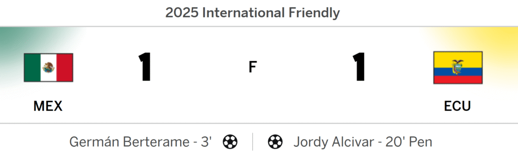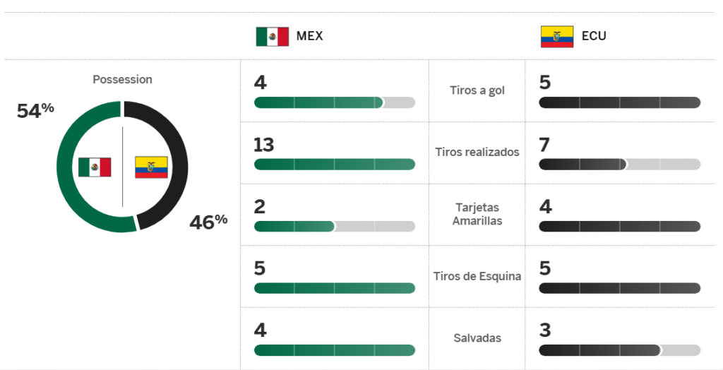 México abrió el marcador temprano en el partido, a los 3 minutos, por un error en la salida entre Willian Pacho y Pedro Vite. Germán Berterame encaró en soledad a Hernán Galíndez para anotar el 1-0.