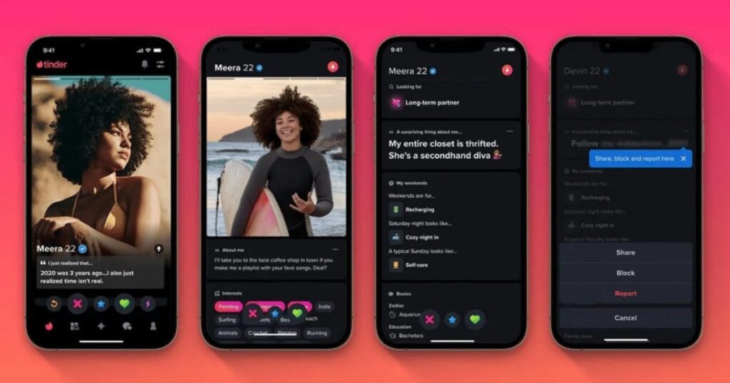 Sin embargo, este año también han destacado los perfiles, para que la información biográfica se muestre en la primera tarjeta de foto y el contenido se integre en el carrusel de fotografía, e introducido los modos de navegación, espacios donde conocer a gente nueva de manera individual o por parejas. Tinder tiene en pruebas una serie de funciones como los ‘Me Gusta’ contextuales y la mensajería abierta, y prepara para el próximo año una nueva «experiencia de producto» impulsada por inteligencia artificial.