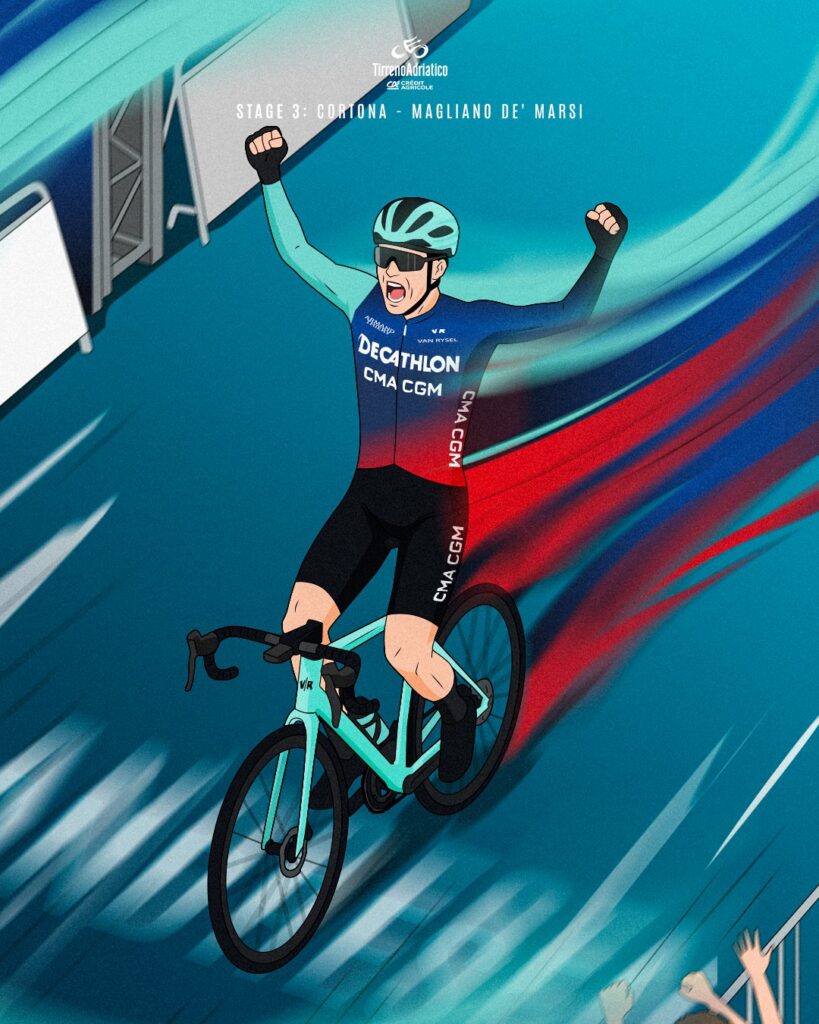 Esta tercera etapa de la ‘Carrera de los dos mares’, de 221 kilómetros entre Cortona (Toscana) y Magliano de’Marsi (Abruzos), presentó una jornada tranquila, sin dificultad y con un final anunciado y respetado para los velocistas. Los Milan, Magnier, Philipsen o incluso Wout Van Aert aspiraban a la gran pelea en los metros finales, tras las con una ligera subida durante los últimos 15 km hasta la recta final (aproximadamente un 3 %).