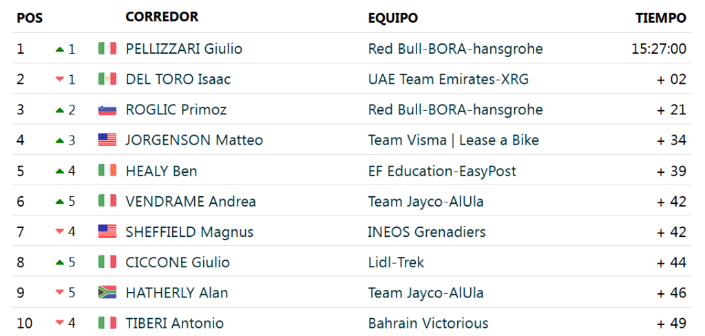 Pellizari es el nuevo líder de la prueba, con sólo dos segundos de ventaja sobre Del Toro, que perdió unos segundos en meta que le costaron la maglia azul de líder.