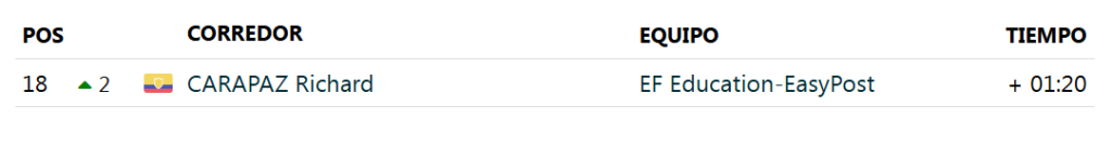 Carapaz cruzó la meta bien ubicado y terminó en el puesto 18 de la etapa, a 14 segundos del ganador. Ese resultado le permitió escalar dos posiciones en la clasificación general.