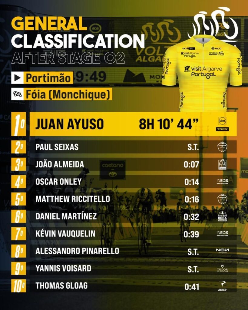 En cuanto a la clasificación general, se presentaron cambios importantes en las primeras posiciones y español Juan Ayuso (Lidl – Trek) se apoderó del liderato, mientras que Daniel Felipe Martínez (Red Bull – BORA – hansgrohe) subió a la sexta posición.