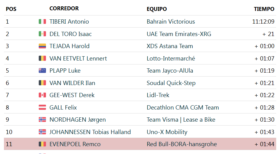 En la clasificación general no se produjeron cambios entre los favoritos. Antonio Tiberi (Bahrain-Victorious) mantuvo el maillot rojo de líder, con Isaac del Toro (UAE Emirates-XRG) segundo a 21 segundos y Harold Tejada (XDS-Astana) tercero a un minuto.